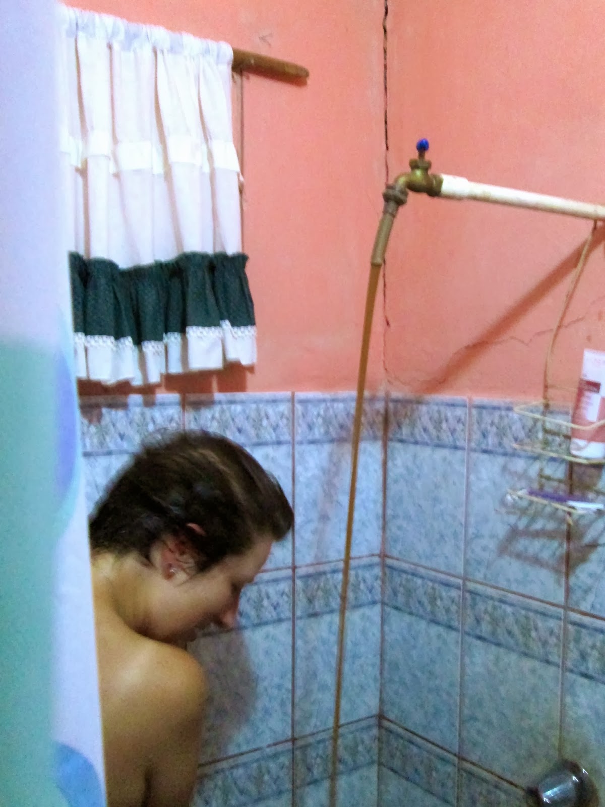 This for anyone complaining about their uni digs.. this is our 'shower' after it has rained a bit too much, we're not sure if that's Kate's tan line or a dirt line..